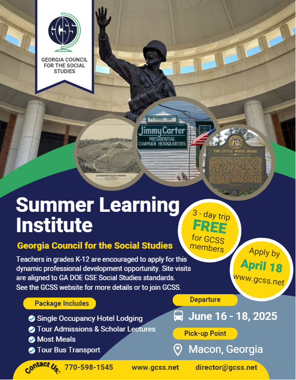 June 16-18, 2025 Open to Teachers in Grades K-12 Click Here for – Detailed Itinerary Click Here for Application Due by April 18, 2025 Click Here to See Accommodations –Columbus Marriott No Cost for GCSS Members! Need to Join GCSS? Click Here Questions? – Contact Dr. Rhonda Webb (director@gcss.net)